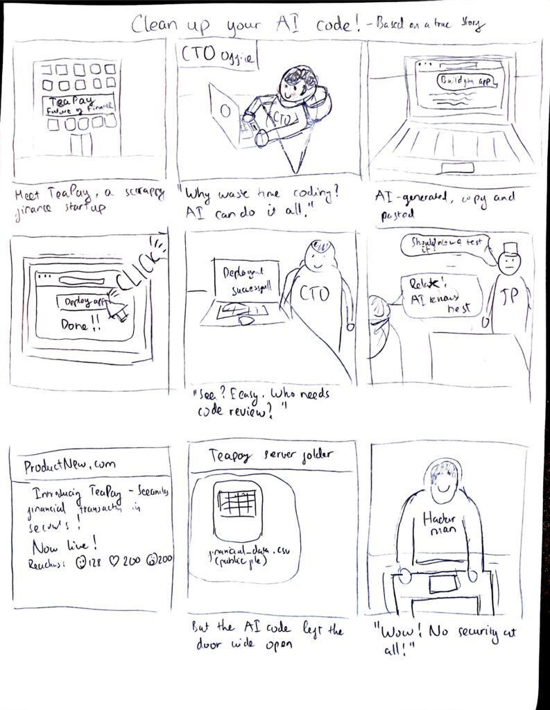 My most promising prototype has the following story flow: Showcase a worst case example of a leak based on the story of the Tea application leak (showcase a non-technical CTO “vibe coding” the app, then the leak, then the media coverage and downfall of the company), then show an alternative version on how this would have be prevented.